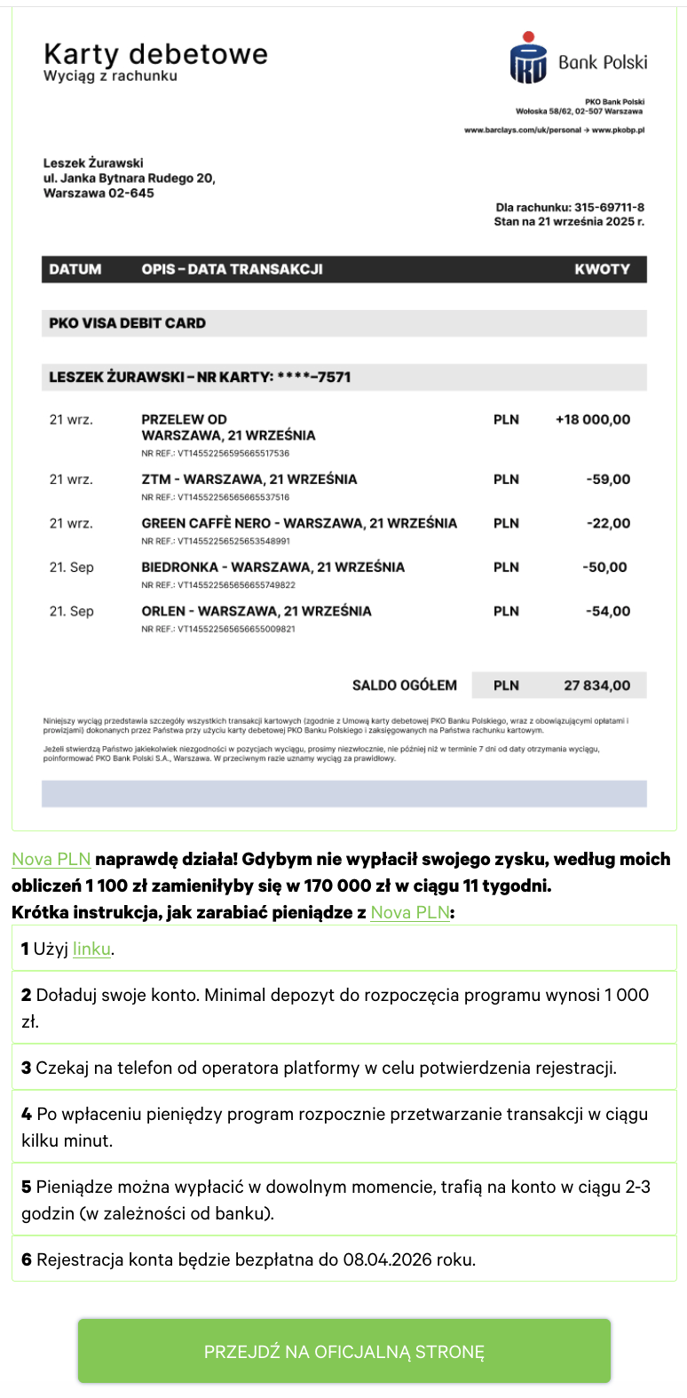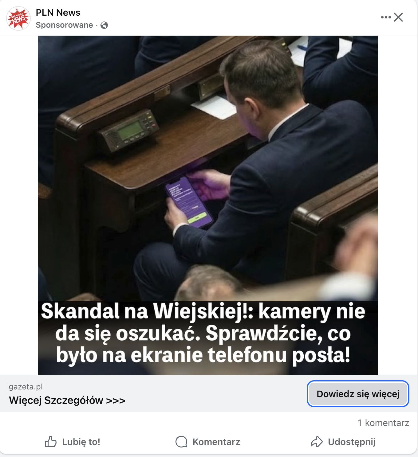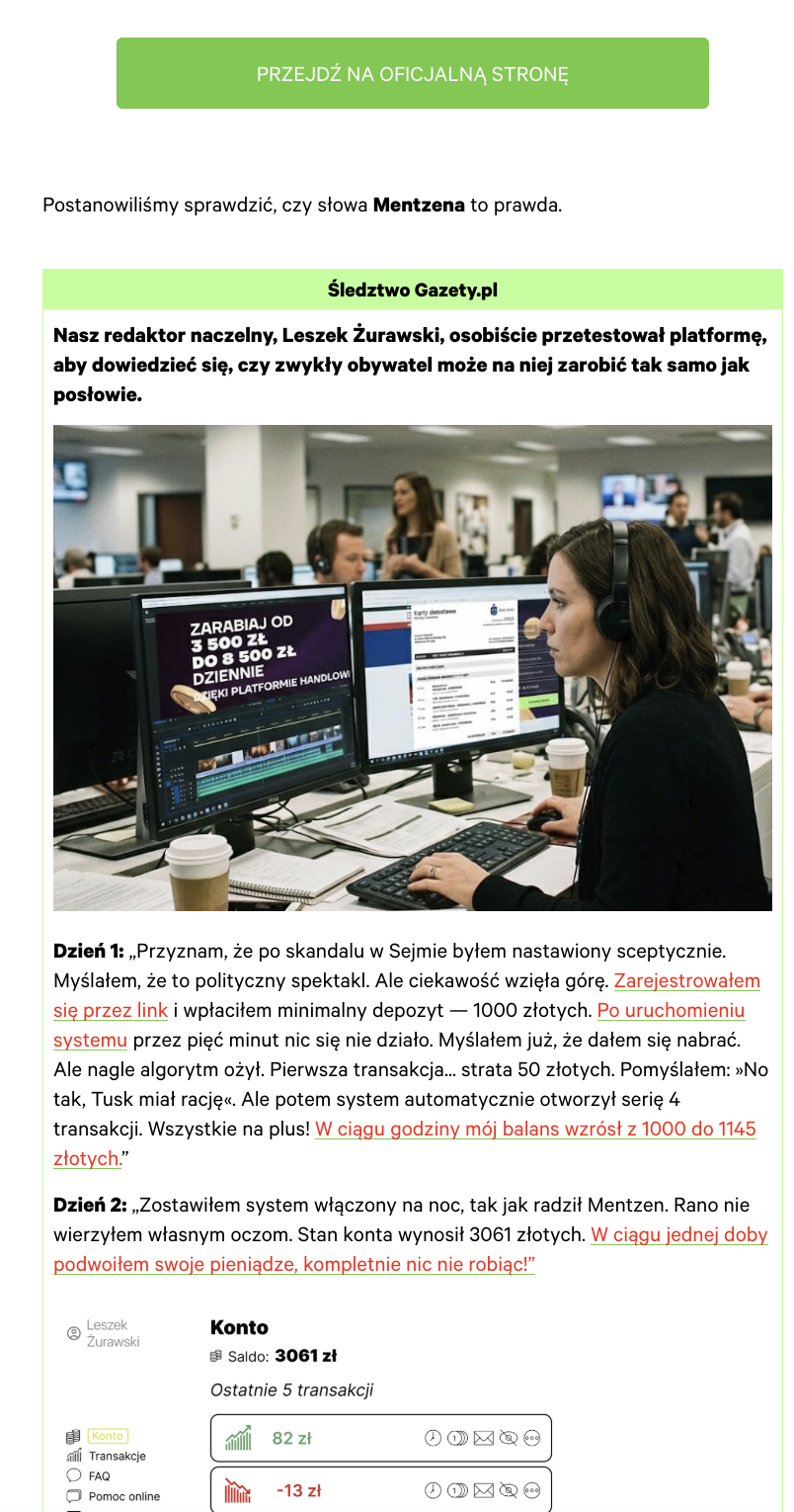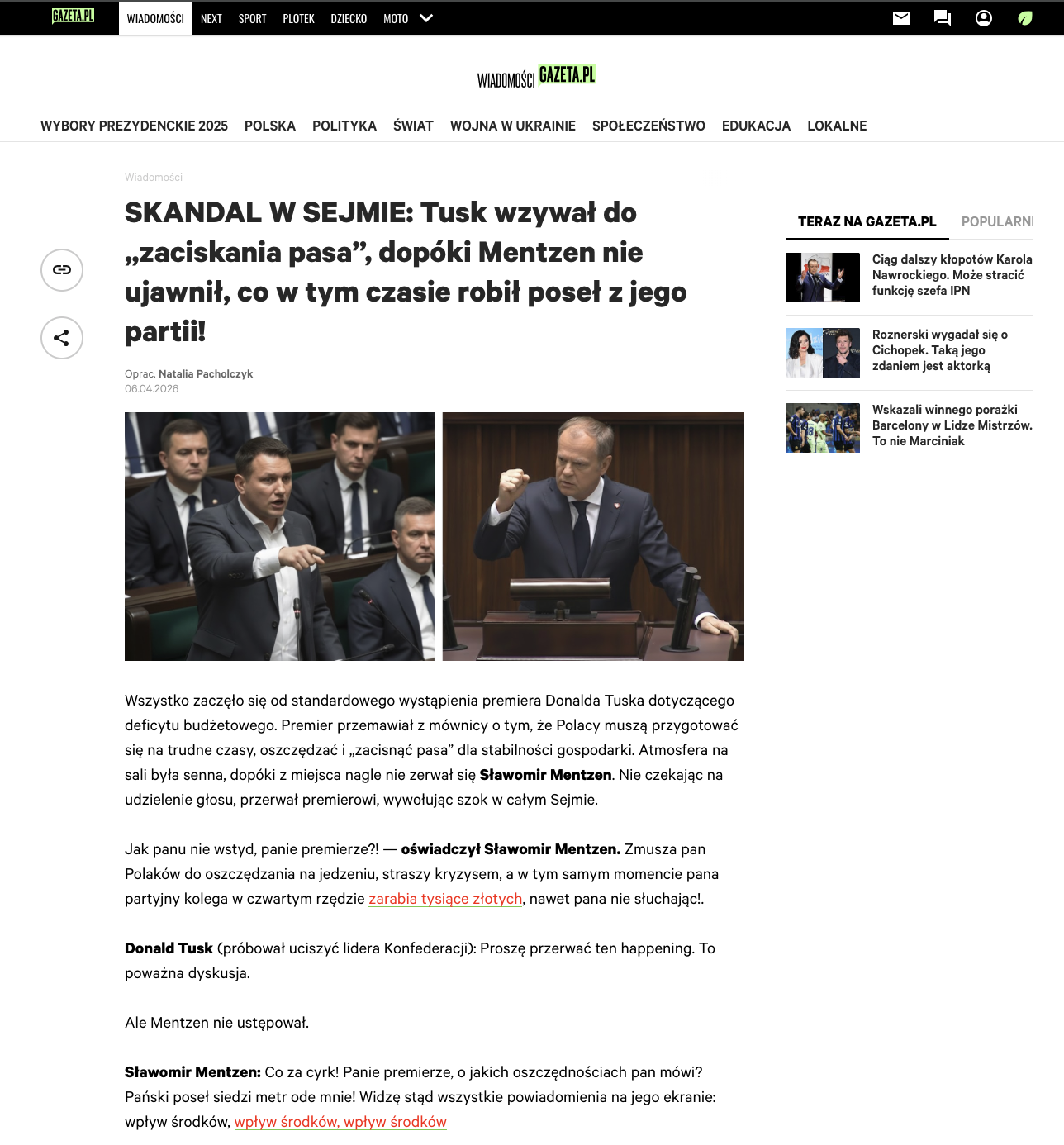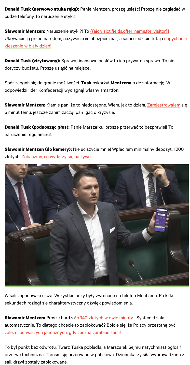 Po kliknięciu w reklamę użytkownik ląduje na stronie, która wygląda jak wiarygodny portal informacyjny (często kopia Wiadomości albo Faktów). Tekst jest napisany tak, jakby właśnie teraz, w tej chwili, w Sejmie działo się coś wielkiego.